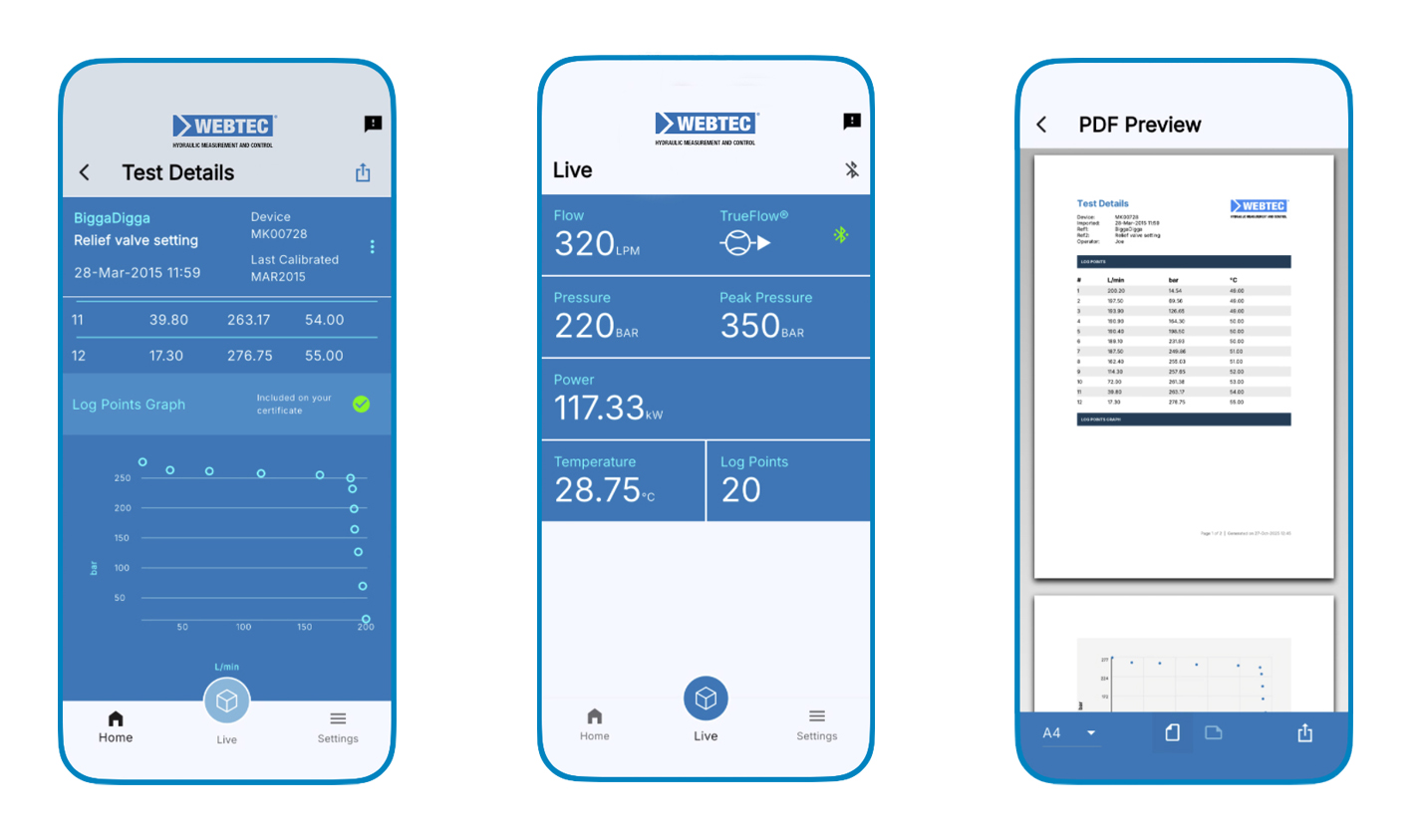 QuickCert®+ is a professional reporting and certification companion for compatible Webtec 3rd Gen DHM hydraulic multimeters. Connect via Bluetooth to view live measurement data, retrieve logged test results, and generate shareable PDF certificates—directly from your phone. Designed for field service engineers and maintenance teams, QuickCert®+ streamlines the workflow from diagnostic test to documented proof.